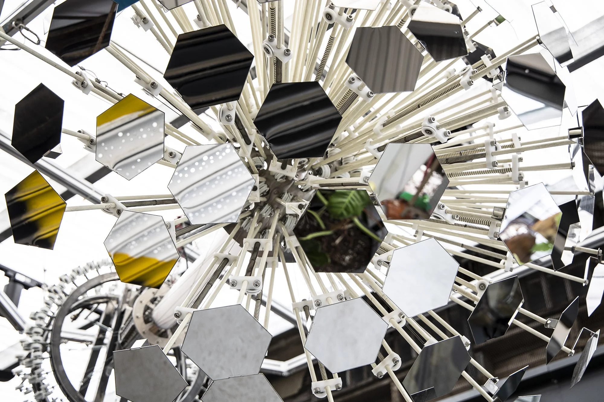 The mechanical concept has always been the main axis of my creation, and the dynamics of mechanical activities are an extension of my own feelings. The use of a hemispherical hexagonal mirror is like a three dimensional moon that simulates the breathing sensation of the fluctuating lake surface.
